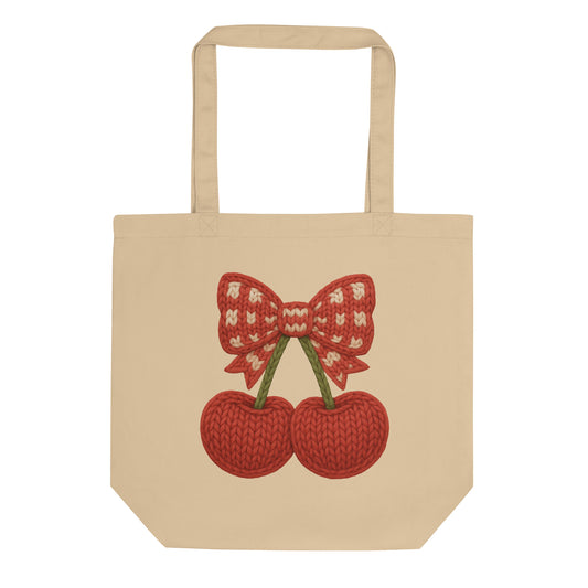 Faux Cozy Knit Cherry Bow Tote Bag